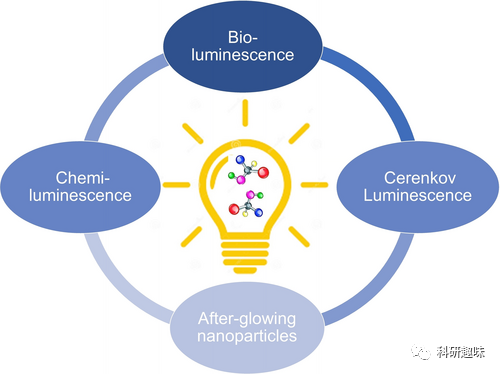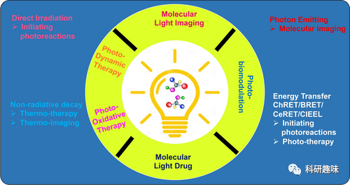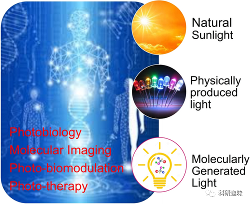 然而,如何将光有效地送入深层组织是一个挑战。与包装药物分子不同,将自然阳光和照明光包装成药剂并在体内传递是不可行的。要实现像分子一样的光传递,光必须与分子有关联。实际上,光可分为自然光、设备产生的物理光和分子产生的光三大类,其中分子产生的光被称为 "分子光" 或 "自发光" 分子。 图1. 光的几种常见来源