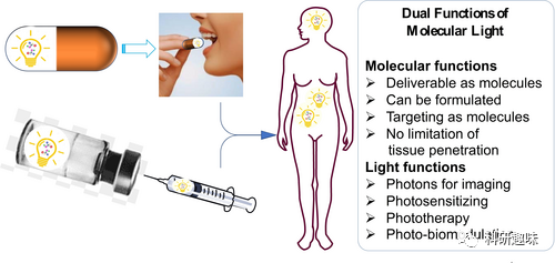 "分子光"的概念确实为我们对分子与光之间内在关联的理解开辟了新的视角,为探索这一现象提供了新的框架。虽然在生物医学成像领域已经对分子光进行了广泛研究并有了详实的文献记录,但将分子光作为一种药物的概念则引入了一个新领域,这个领域目前还相对未被深入挖掘。