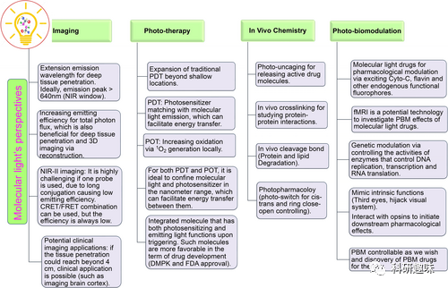 这段部分作者主要探讨了分子光在生物医学研究中的潜在应用,包括光动力疗法(PDT)、光学成像、光疗法、体内光化学和光药理学等方面。 图11. 分子光在成像、光治疗、体内化学和PBM方面的一些展望