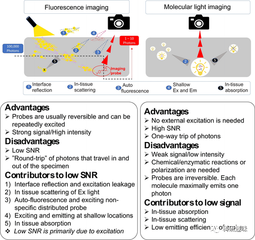 图5. 荧光成像和分子光成像的途径及优劣势