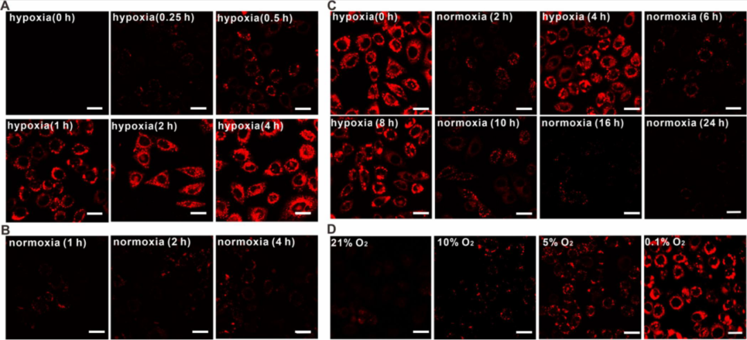 为了研究TPFN-AzoCF3在癌细胞中的循环响应行为,作者在HeLa细胞中进行了共聚焦荧光成像(图3)。结果显示,在缺氧条件下,随着培养时间的延长,荧光强度逐渐增强,表明TPFN-AzoCF3对缺氧环境有良好响应(图3A)。相比之下,在常氧条件下4小时培养后,荧光变化微乎其微,说明TPFN-AzoCF3仍处于关闭状态(图3B)。此外,当将细胞暴露于缺氧-常氧-缺氧环境中时,TPFN-AzoCF3呈现荧光开关行为。随着氧浓度从21%下降到0.1%,荧光强度逐渐增强,表明TPFN-AzoCF3随环境缺氧程度加剧而发生更有效的还原。同时,抑制偶氮还原酶后,即使在缺氧条件下荧光增量也很小,说明偶氮还原酶介导的偶氮基团还原是荧光开启的原因。