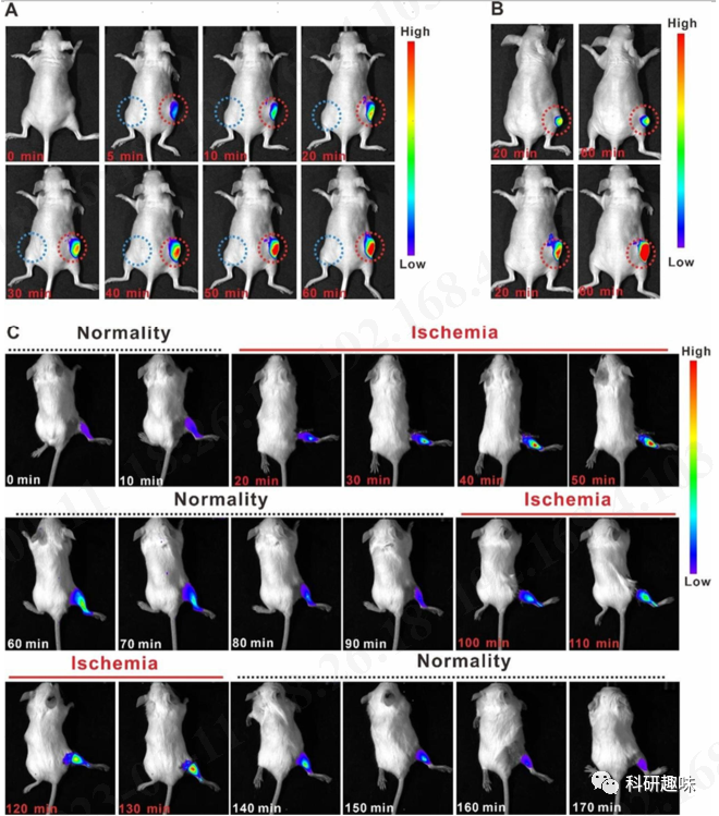 受体外实验结果的鼓舞,作者随后在不同小鼠模型中进行了体内实验。在给HeLa肿瘤小鼠皮下(常氧)和瘤内(缺氧)区域分别注射TPFN-AzoCF3后,观察到两区域荧光强度存在显著差异。特别是0-60分钟内,缺氧肿瘤区的荧光强度随时间延长而增强,而皮下注射区的荧光可忽略,表明正常细胞中的TPFN-AzoCF3没有减少,但肿瘤缺氧环境中发生了还原。使用不同体积肿瘤的小鼠模型发现,随着肿瘤增大,相同剂量TPFN-AzoCF3的荧光增强,说明缺氧环境越严重,还原越彻底。在小鼠肌肉组织进行缺血再灌注试验观察到,TPFN-AzoCF3在缺血缺氧条件下发生还原并发荧光,再灌注后可逆地熄灭,该过程可重复三次,证明了其良好的可逆性。