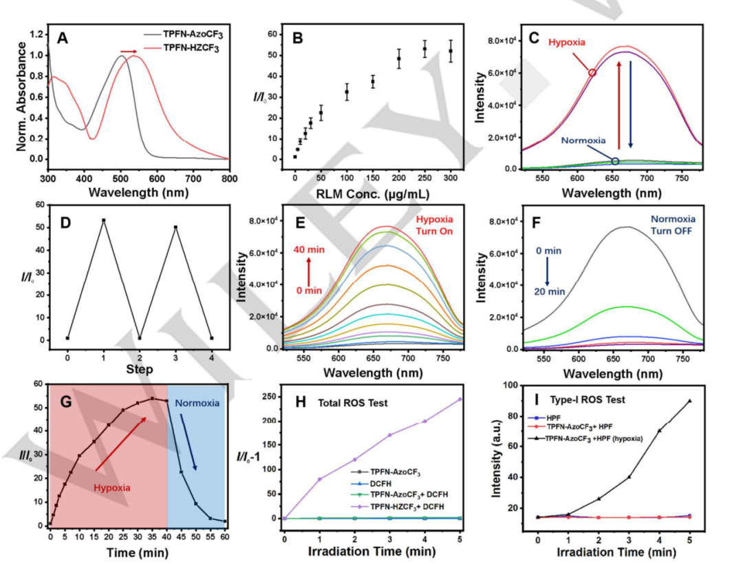 为了研究TPFN-AzoCF3的性能,作者使用含NADPH和偶氮还原酶的大鼠肝微粒体(RLMs)来模拟缺氧环境。当环境从常氧变为缺氧时,TPFN-AzoCF3的吸收峰从500纳米红移到550纳米(图2A)。这是因为在常氧下,芳基偶氮基团的淬灭作用抑制了TPFN-AzoCF3的荧光。在缺氧条件下,TPFN-AzoCF3上的芳偶氮基团转化为肼基团生成TPFN-HZCF3,671纳米处荧光强度因此增强54倍(图2B,C)。此外,TPFN-HZCF3呈现典型的聚集诱导发光特征。将缺氧处理后的溶液暴露在空气中,TPFN-HZCF3的荧光可逆地淬灭至初始状态,表明该过程是可逆的(图2D)。在各种生物相关化学物质或不同pH值下,均未观察到明显荧光变化,说明该探针对缺氧环境具有良好特异性。为监测TPFN-AzoCF3生成ROS的能力,使用DCFH作为ROS指示剂。结果显示,TPFN-AzoCF3的ROS生成能力较低,但TPFN-HZCF3能有效产生ROS。不同指示剂实验表明,TPFN-HZCF3主要产生I型ROS(图H,I)。质谱和NMR实验结果表明,在缺氧条件下,偶氮键仅部分还原为肼中间产物,并证实了该可逆过程。