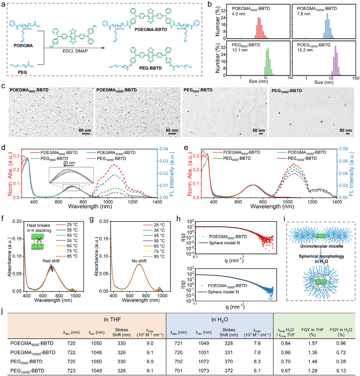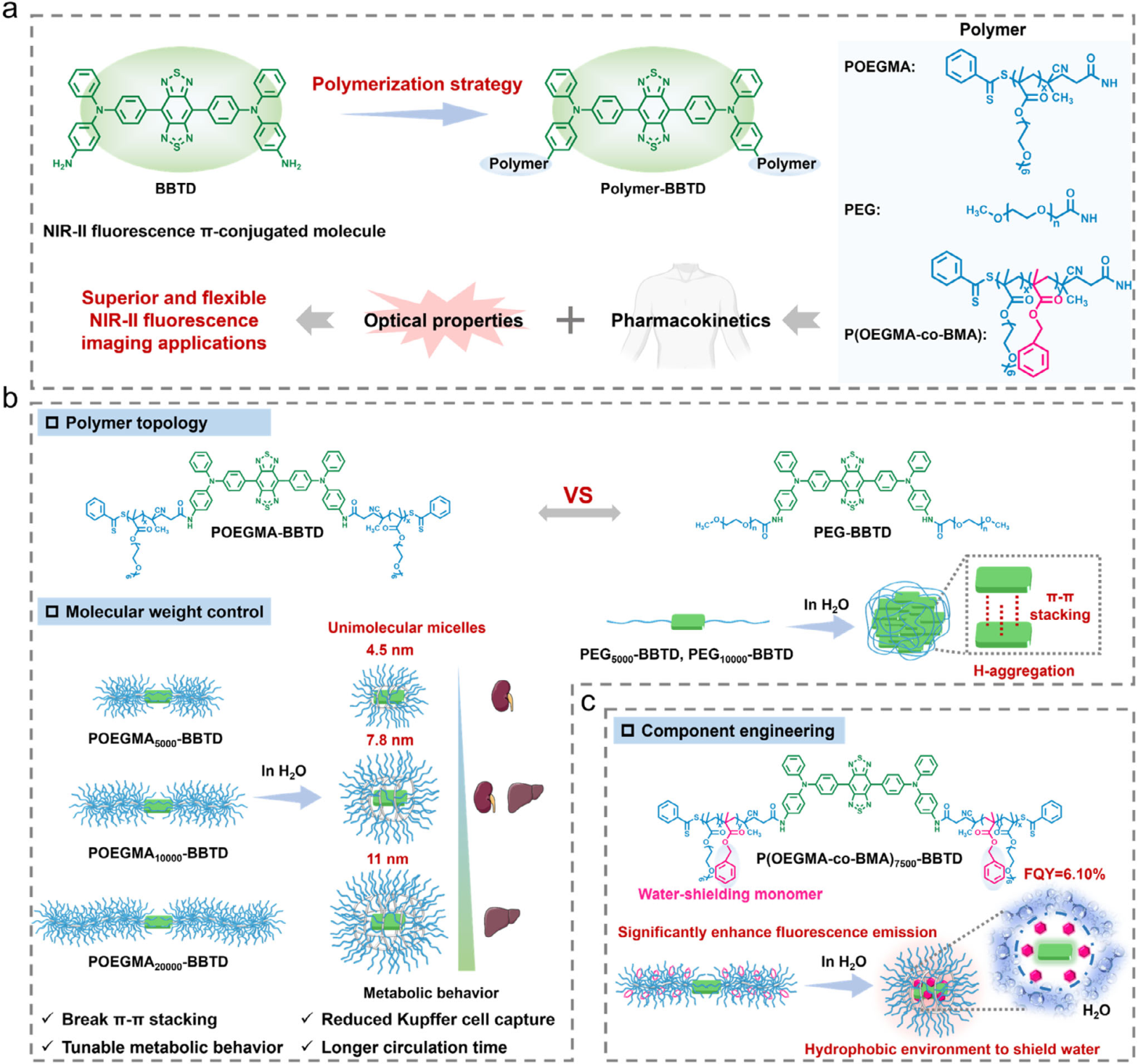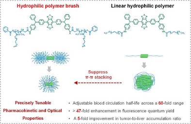 他们为核心的荧光分子(BBTD)接上了两把立体的“高分子刷”(POEGMA) 。这种刷子状的结构拥有浓密的“刷毛”,形成了一个强大的空间屏障,就像一个360度无死角的保护罩,从根本上阻止了荧光分子相互靠近和“黏连” 。