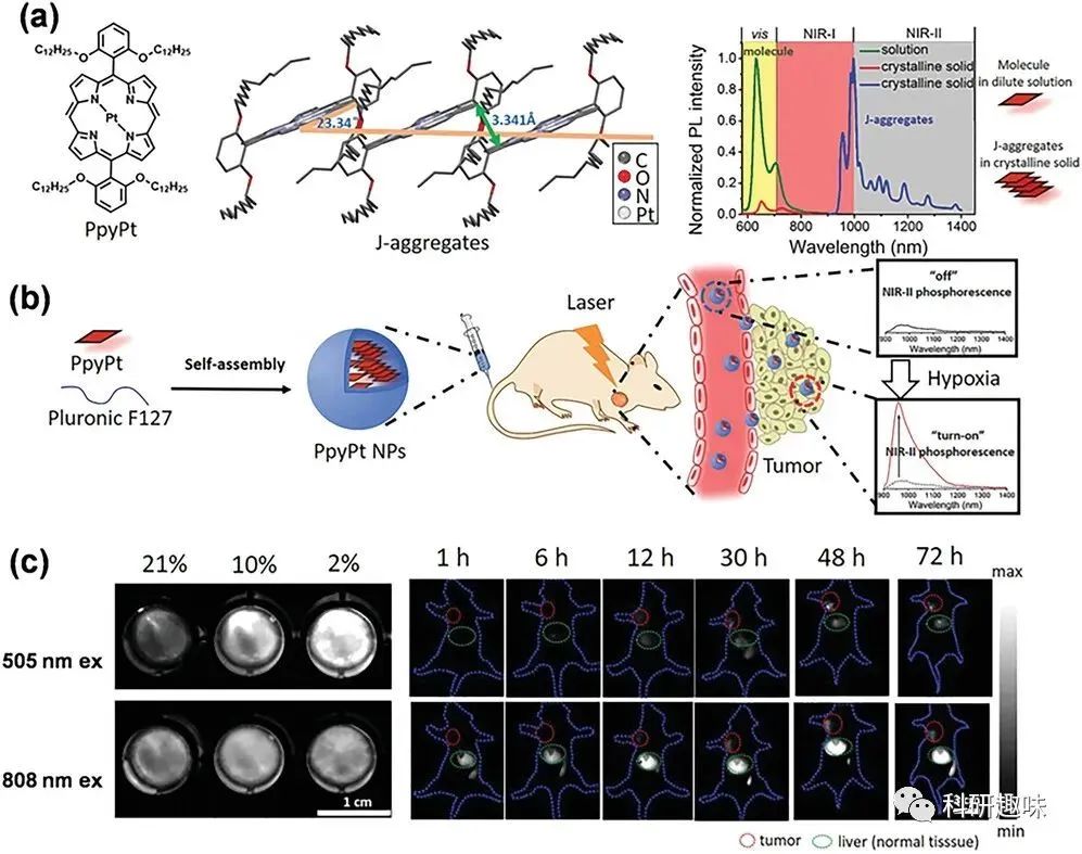 - Zhang et al.的设计: 使用新型有机金属纳米平台(PpyPt NPs 4.76),引入具有位阻作用的苯环功能基团,实现高度特异性肿瘤定位的高效氧敏感NIR-II FI技术。