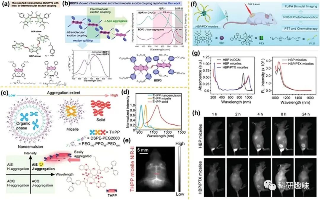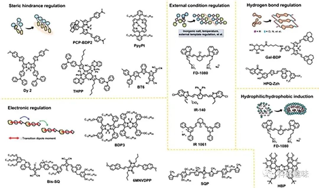在过去的几十年里,学者们已经开发了许多J-聚集体,包括PBIs、BODIPYs、卟啉、方酸染料和花菁染料。然而,大多数报道的J-聚集体发射的信号位于传统的NIR-I或可见光区域。到目前为止,已经成功探索了几种包含BODIPY衍生物、花菁分子、方酸、卟啉衍生物、二酮吡咯吡咯、苯并[c]噻吩和喹唑啉酮衍生物的NIR-II J-聚集染料(方案1和图8)。