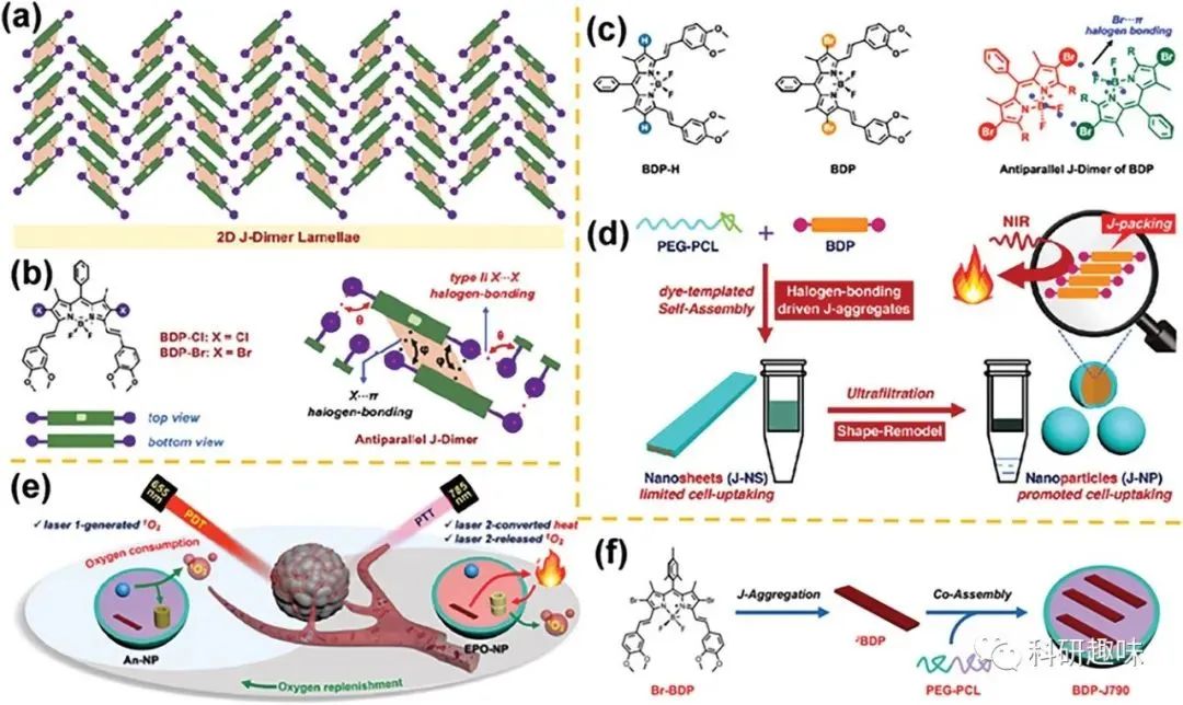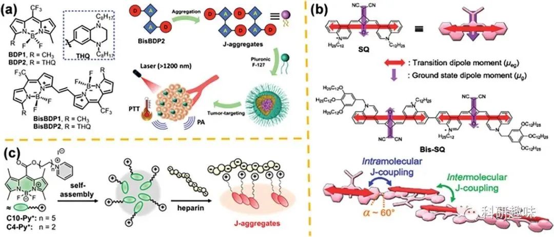 最近,李的研究团队精心设计了一种刺激响应的核壳纳米平台,由亲水PEG壳和堆积的BODIPY(BD-PGMe)组成(图5a)。另一个通过两性诱导J-聚集的代表性范例是通过引入两性脂质体。例如,郑等人报道并合成了一种创新的aza-BODIPY-脂质体构建块,然后推动其用于肿瘤的多模态光学成像(图5b)。