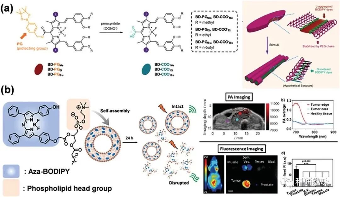 图5. a) 两种 BODIPY 的分子结构以及 J-聚集排列和刺激响应堆叠重排的示意图。b) 用于体内 PAI 和 FI 的 J-aggregated BODIPYsome 纳米粒子的形成。