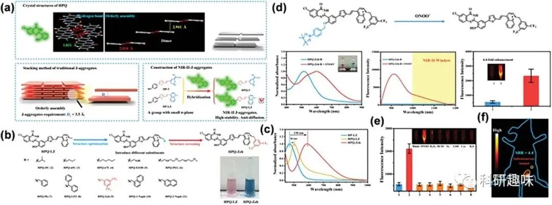 相对于传统的“始终开启”的J-聚集荧光探针,可激活的荧光物质在生物标志物刺激下能够改变特定的发射信号,具有特异性。最近,张等人创新性地提出了一种通过有序J-聚集的原位分子自组装方法,制备可激活的NIR-II荧光探针,克服了引入不稳定外源模板的问题。该方法利用喹唑醌衍生物(HPQ)的氢键和π-π相互作用构建智能NIR-II J-聚集体。