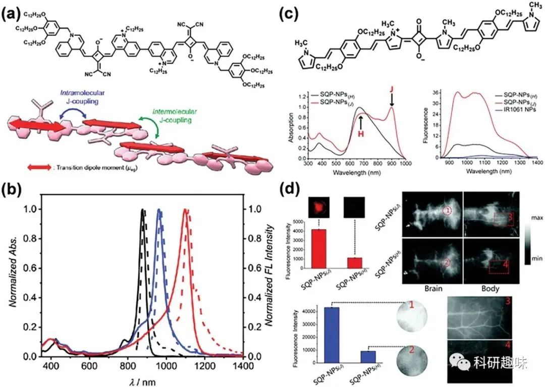 2.Wurthner团队的设计: 基于双激子偶合策略,Wurthner教授团队设计并合成了具有NIR-II发射的J-聚集Bis-SQ荧光团。