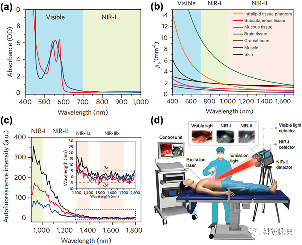 图1. a) 人体血液中氧合血红蛋白(红线)和脱氧血红蛋白(蓝线)的紫外-可见-近红外吸收光谱。b) 不同生物组织在 400 至 1700 nm 范围内的光学散射系数。c) 在 808 纳米光激发下,体外心脏组织(蓝色)、脾脏(红色)和肝脏(黑色)的自发荧光光谱。d) 首例人体 NIR-II FI 的外科肿瘤切除术。