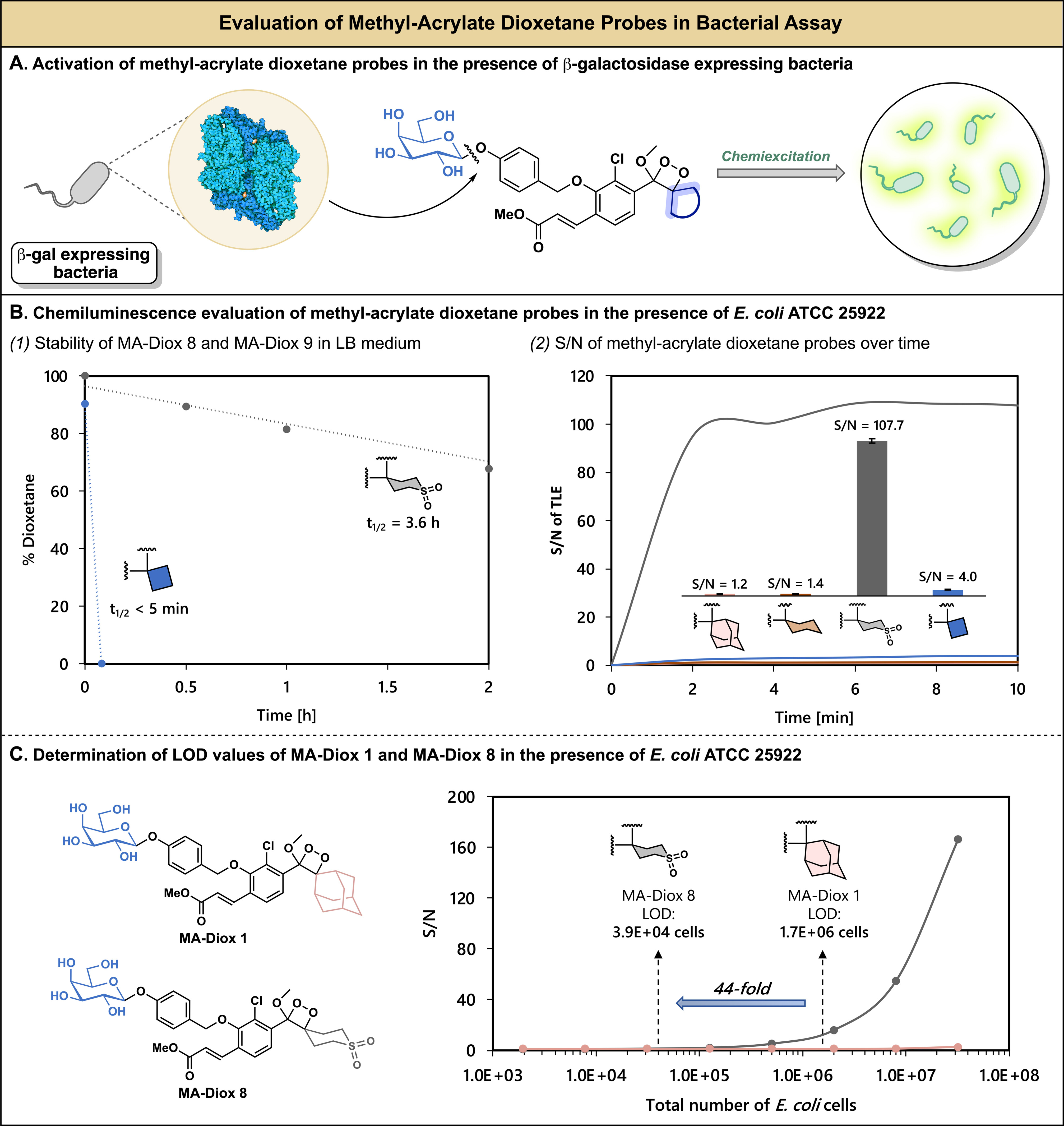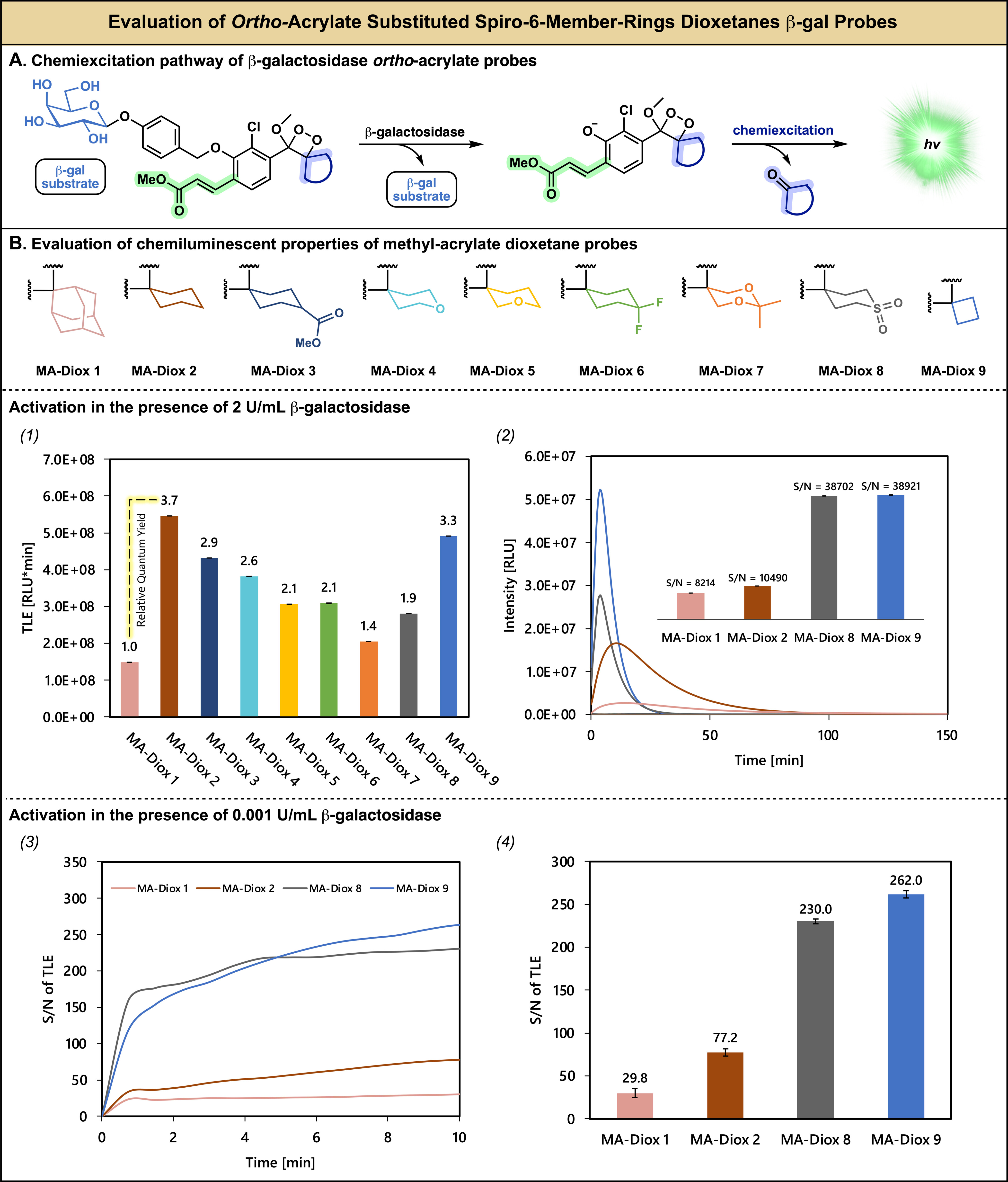 利用含有硫酸酯基团的六元环二氧杂环丁烷合成的探针MA-Diox 8,在检测β-galactosidase活性时显示出极高的检测灵敏度