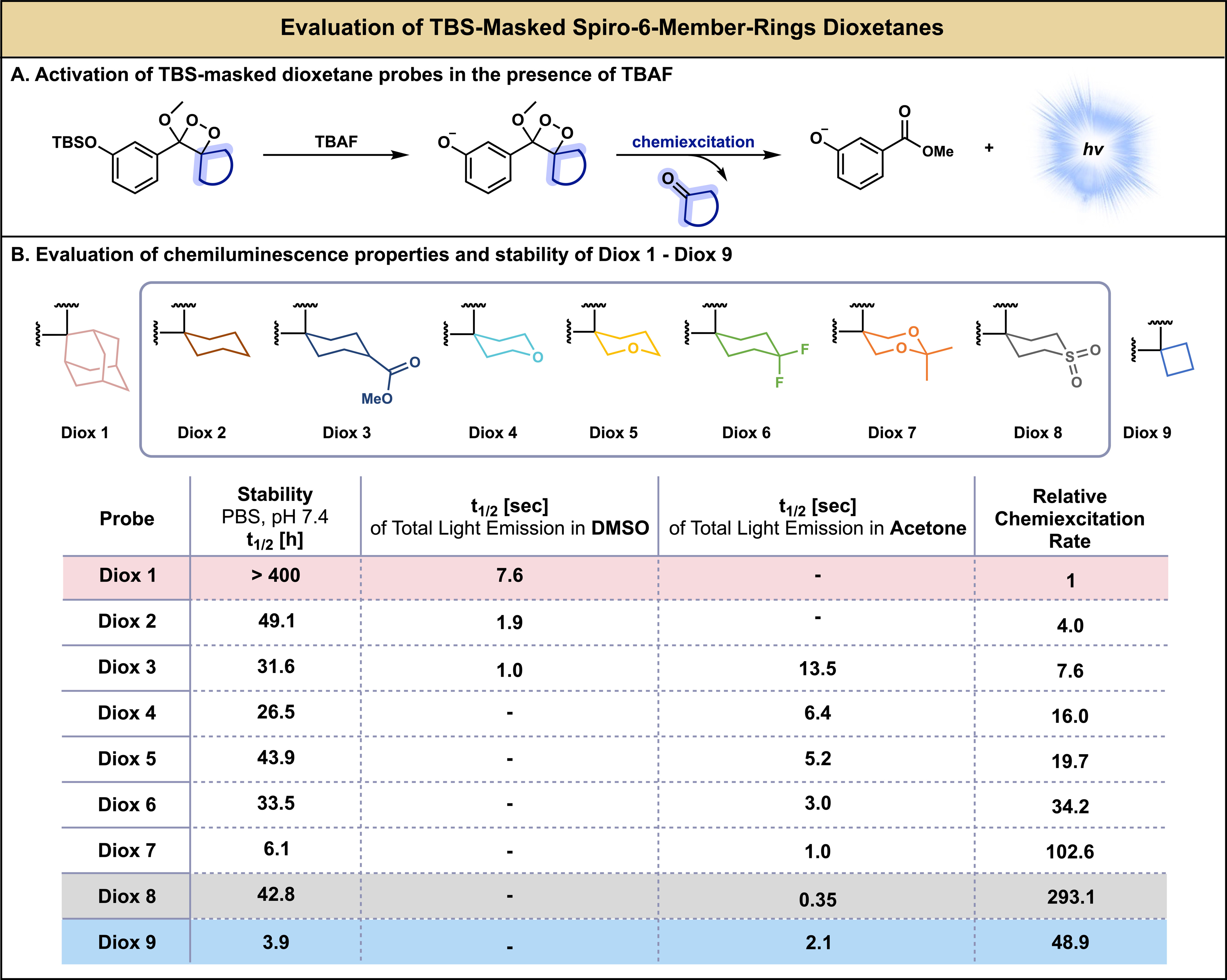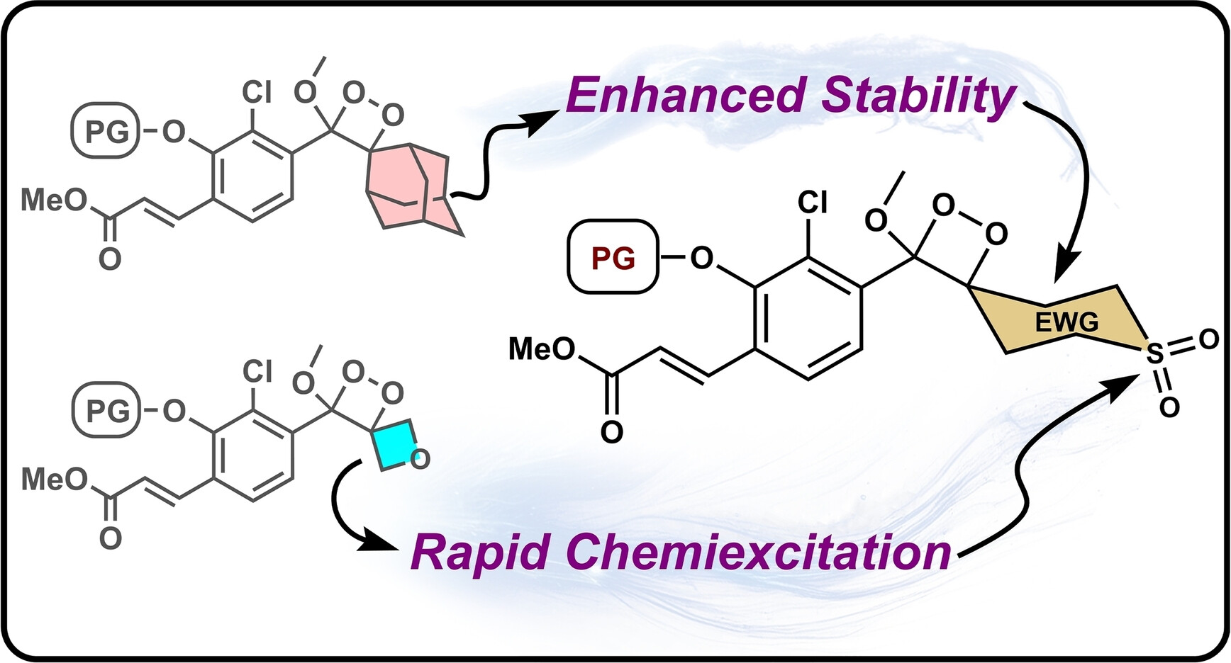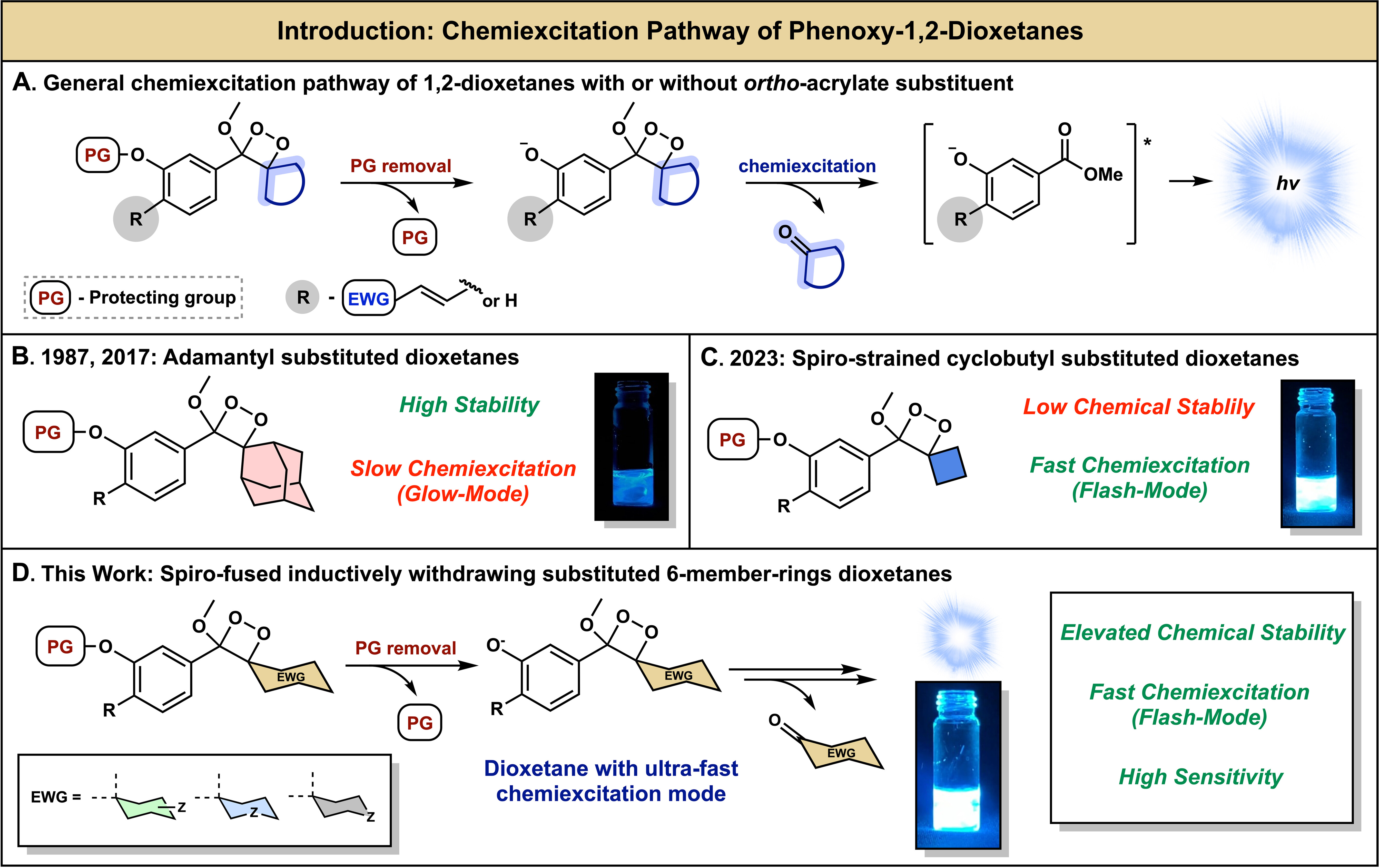 本研究揭示了通过引入螺合六元环吸电子基团,可以显著加速1,2-二氧杂环丁烷的化学激发速率,从而提高了化学发光探针的检测灵敏度。