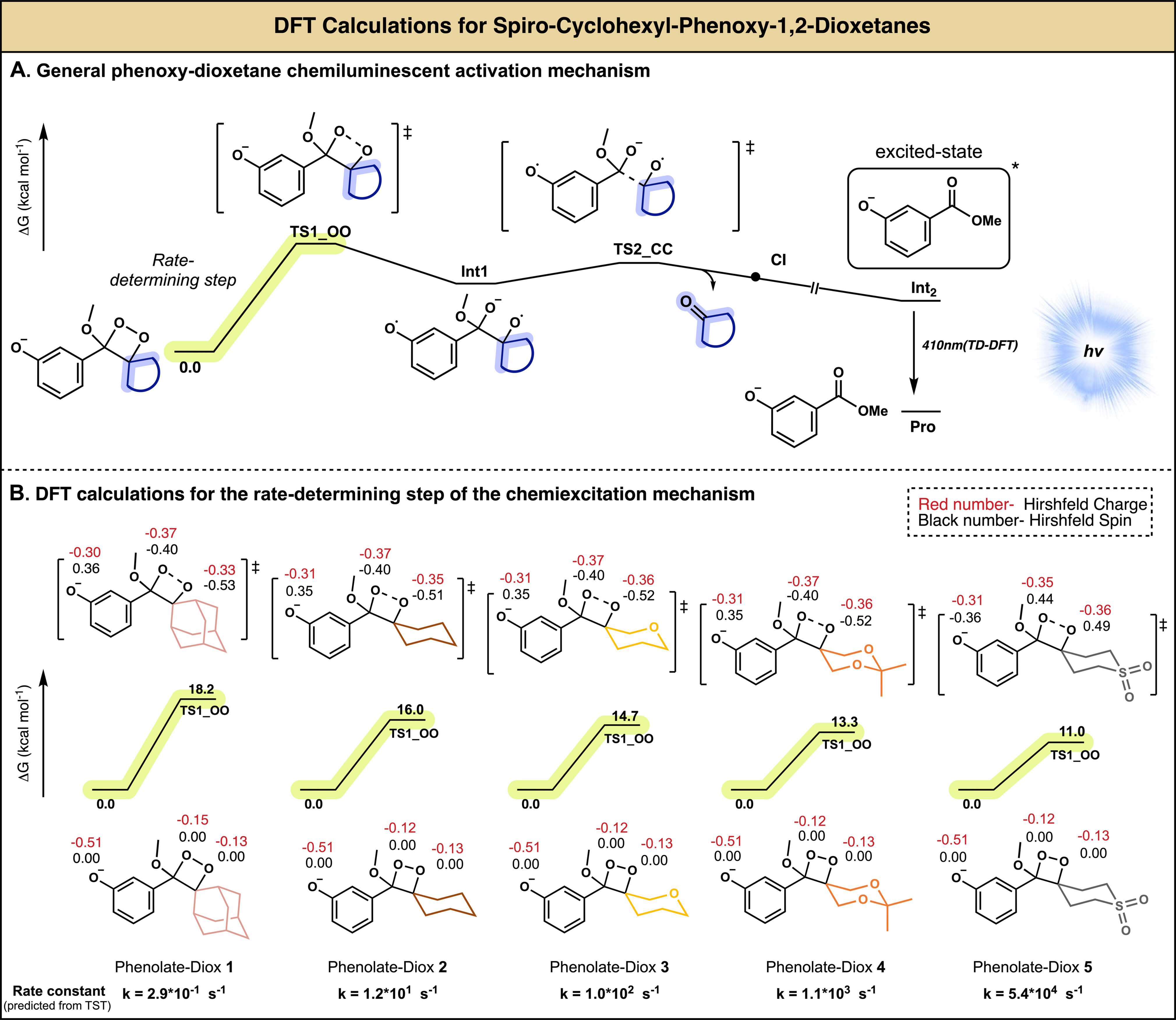 引入螺合六元环吸电子基团可以显著提高1,2-二氧杂环丁烷的化学激发速率