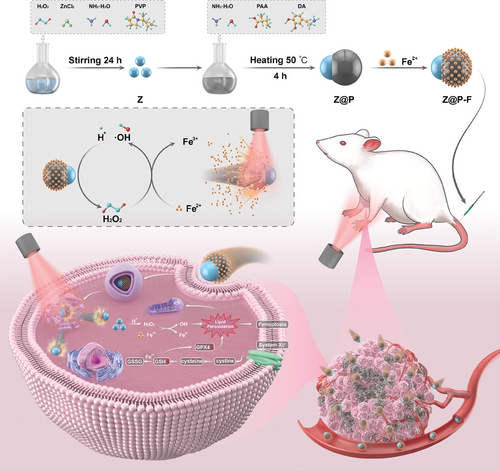在这项研究中,研究者们设计并制备了一种NIR光激活的自热力驱动的纳米马达,用于增强肿瘤穿透和治疗。该纳米马达是用过氧化锌(ZnO2)对聚多巴胺(PDA)进行不对称修饰,然后通过PDA中的多酚基团螯合亚铁离子(Fe2+)而产生的。在NIR光照射下,Z@P-F纳米马达能够产生温度梯度,从而通过自热力作用增强其在肿瘤微环境中的扩散能力,有助于溶酶体逃逸并促进深入肿瘤组织。同时,在酸性肿瘤微环境中,Z@P-F能够缓慢释放H2O2和Fe离子,通过激活CDT和PTT,有效地促进了肿瘤细胞的铁死亡。实验结果表明,该纳米马达在体内外都展现出了显著的肿瘤杀伤效果,并且具有良好的生物相容性和安全性。