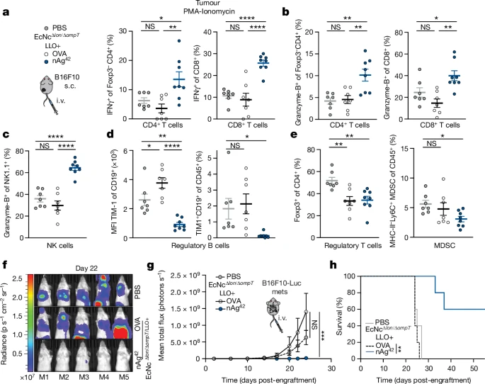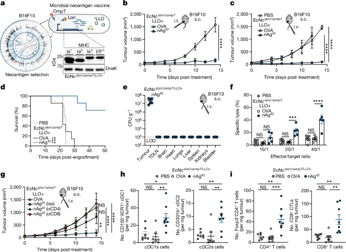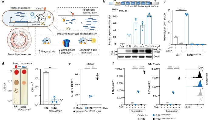 在这项研究中,科学家们利用合成生物学技术,改造了益生菌大肠杆菌Nissle 1917(EcN),使其能够表达和递送肿瘤特异性的新抗原。这些新抗原是由肿瘤细胞的突变产生的,能够被免疫系统识别为非自身成分,从而激活免疫反应。