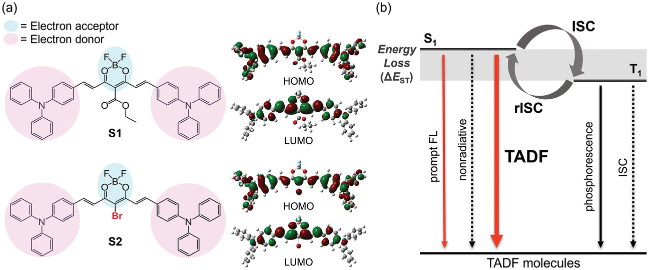 a) TADF 感光剂 S1 和 S2 的化学结构和分子轨道。