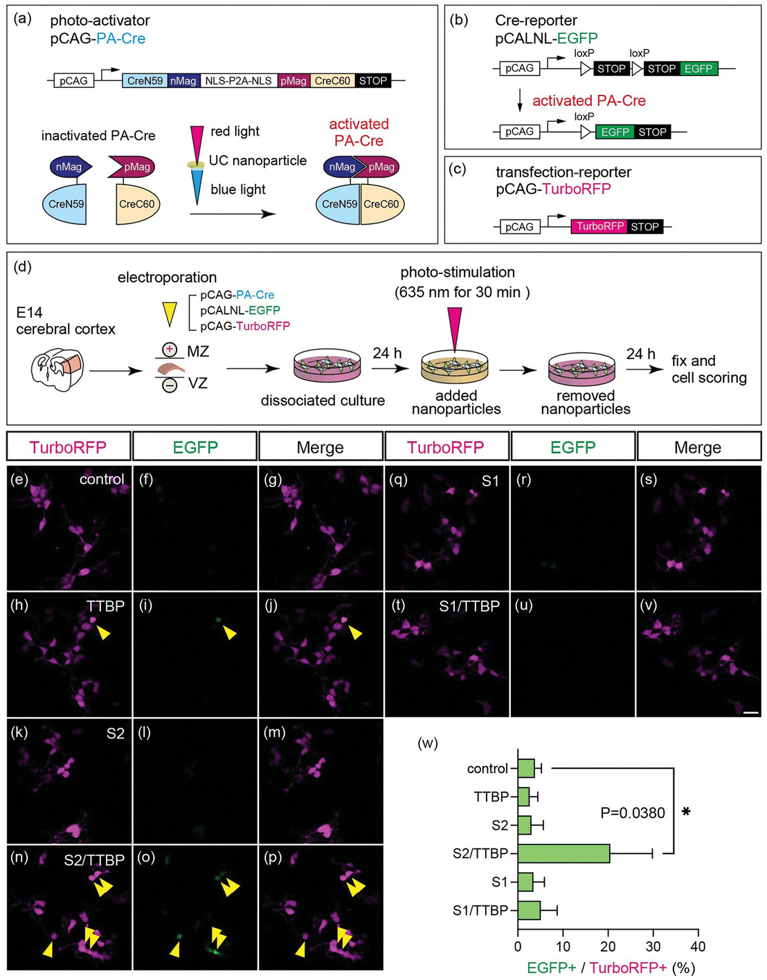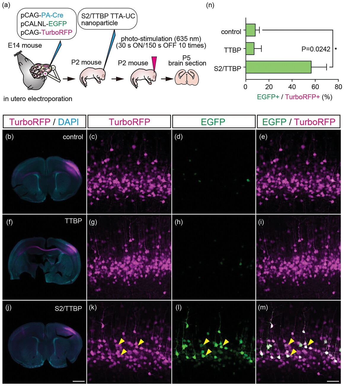 通过Cre-reporter EGFP的表达,TTA-UC纳米颗粒可作为光遗传学的内部光源进行皮下注射,而不会穿透和损伤脑实质。