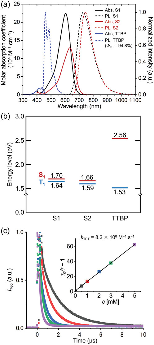 a)S1(黑色)、S2(红色)和 TTBP(蓝色)的光谱([S1] = 20 µM,λex = 590 nm;[S2] = 20 µM,λex = 630 nm;[TTBP] = 100 µM,λex = 414 nm)。 b) S1、S2 和 TTBP 的激发单线(S1)和三线(T1)能级。 S1、S2 和 TTBP 的 S1 能级是根据室温下荧光的峰值波长确定的。 S1 和 S2 的 T1 能级是根据磷光(77K)光谱的峰值波长确定的。 TTBP 的 T1 能级已在之前的研究中报告过。c) 不同浓度下 S2 的发光淬灭实验([S2] = 200 µM,λex = 630 nm,λdetection = 760 nm)。 τ0 和 τ 分别是敏化剂在没有发射体和有发射体的情况下的延迟荧光寿命。