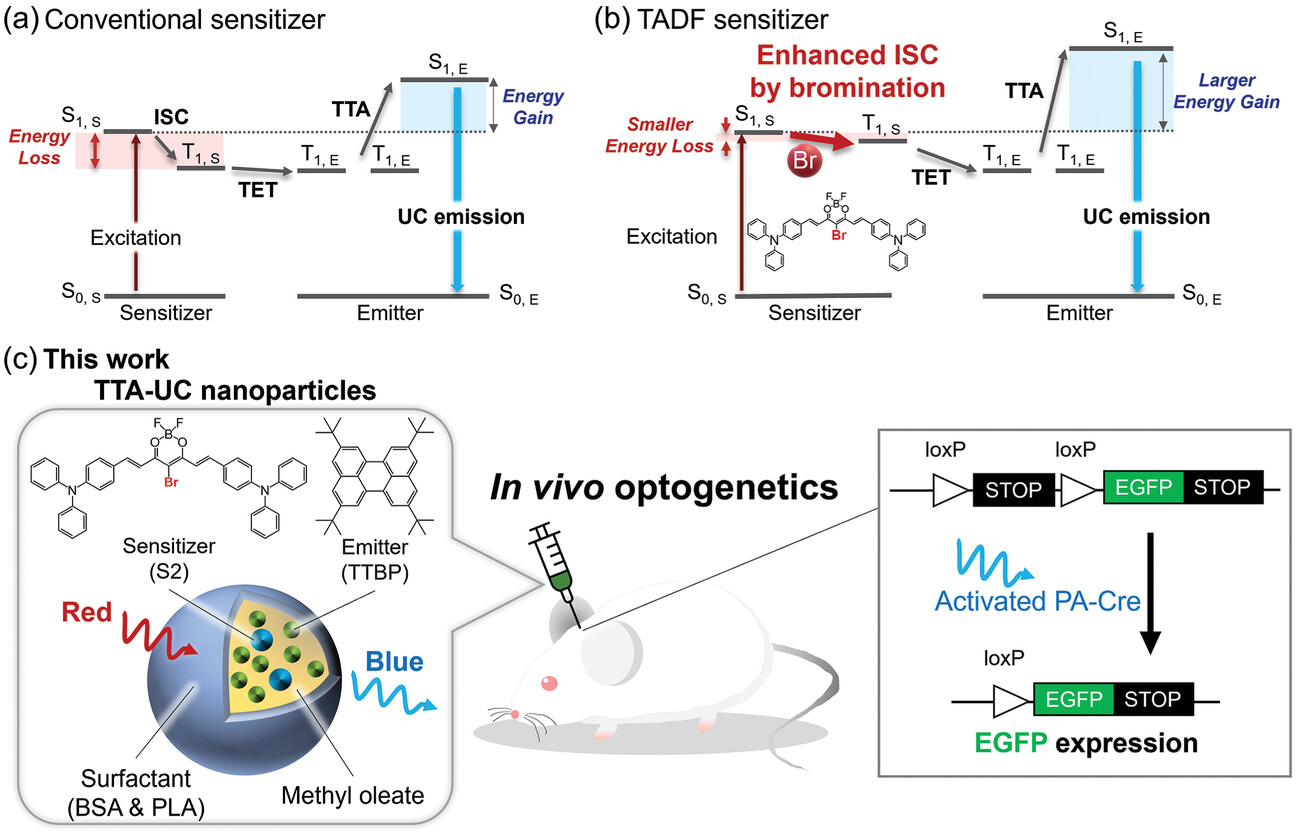 上转化(UC)技术能够将红外或近红外光转换为蓝光,对于体内光遗传学研究具有重要意义。然而,此前的体内光遗传学研究主要依赖于含有镧系元素的上转化纳米粒子,缺乏不含重金属的材料。本研究首次展示了使用生物相容的无重金属TADF光合型上转化纳米乳液进行体内光遗传学研究的例子。研究者们开发了一种新型有机TADF感光剂,它能够促进系间穿越到激发三重态,显著提高了TTA-UC效率。通过使用生物相容的表面活性剂和油酸甲酯,形成的TTA-UC纳米粒子获得了水溶性和抗氧化能力。结合使用对蓝光敏感的光激活型Cre-重组酶(PA-Cre)及基因工程技术,TTA-UC纳米粒子在体外和体内神经元中促进了Cre-EGFP荧光蛋白的表达。