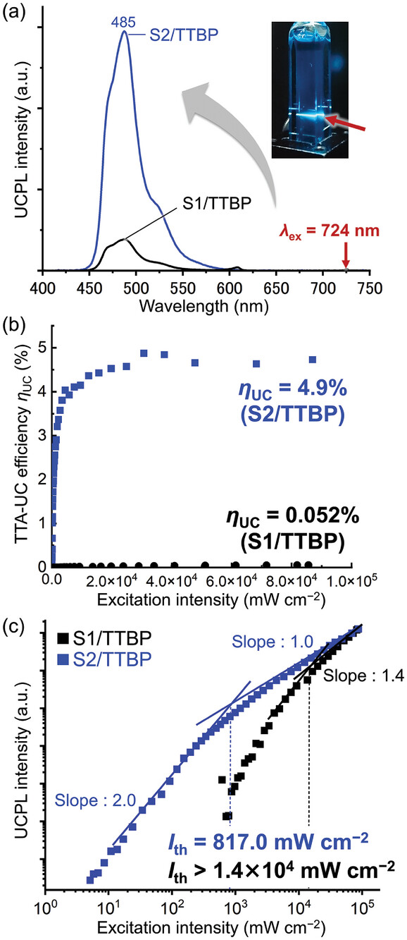 a) S1/TTBP 和 S2/TTBP 的 TTA-UC 光谱。 插图: b) 不同激发强度下的 TTA-UC 效率。 c) 485 纳米波长下 TTA-UC 强度的激发强度依赖性([S1 或 S2] = 200 µM,[TTBP] = 20 mM 于脱气氯仿中,λex = 724 纳米波长,610 纳米短通滤波器)。