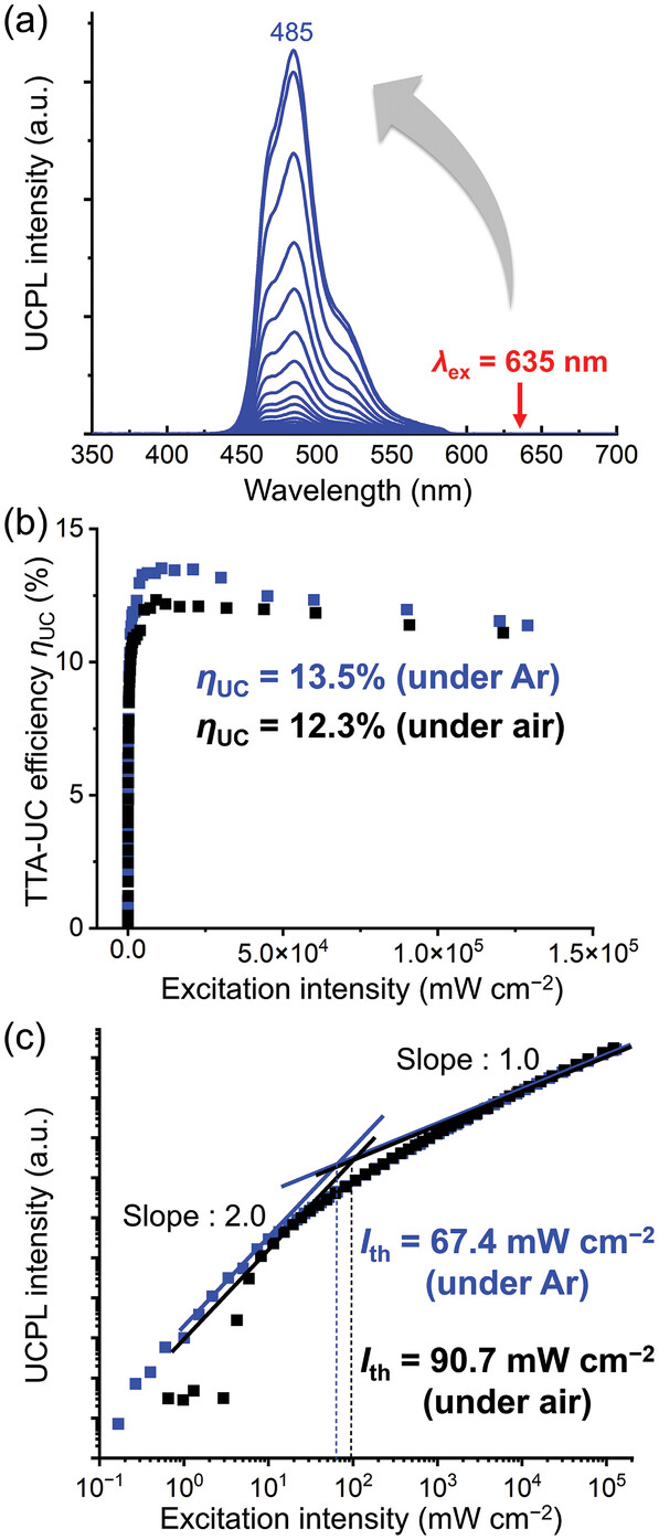 a) 在氩气条件下,从 0.17 mW cm-2 到 1.3 × 105 mW cm-2 的不同激发强度下的 TTA-UC 光谱;b) 不同激发强度下的 TTA-UC 效率;c) 485 纳米波长处 TTA-UC 强度的激发强度依赖性([S2] = 200 µM,[TTBP] = 20 mM 于油酸甲酯中,λex = 635 纳米波长,610 纳米波长短通滤波器)。