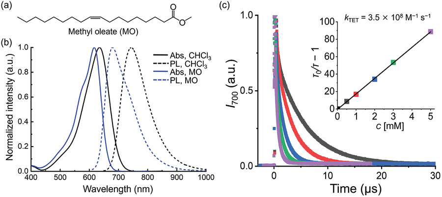 a) 油酸甲酯 (MO) 的化学结构。 b) S2 在氯仿(黑色,[S2] = 20 µM,λex = 630 nm)或油酸甲酯(蓝色,[S2] = 20 µM,λex = 600 nm)中的吸收(实线)和光致发光(虚线)光谱。c) S2/TTBP 在不同浓度下的荧光淬灭实验([S2] = 200 µM,λex = 600 nm,λdetection = 700 nm)。 插图:相应的基于寿命的 Stern-Volmer 图。