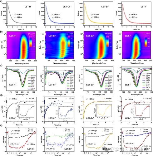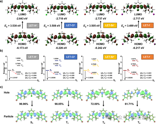 图2. 理论计算分析通过瞬态光谱和密度泛函理论(DFT)计算,研究人员揭示了LET-I光敏剂的高荧光量子产率(Φf)和1O2量子产率(Φ1O2)的原理,这与I原子诱导的系间穿越(ISC)过程和放射性衰变有关。