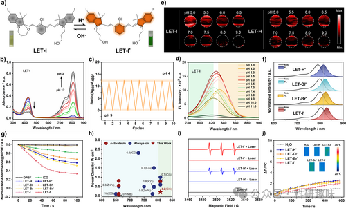 图1. pH 活化、光物理和光化学特性。LET-R光敏剂的设计基于花菁类染料骨架,引入了环己烷环以增加分子的稳定性,并通过酸性条件下的特定化学键断裂来实现光学性质的改变。