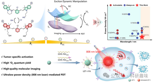 在本研究中,研究人员通过设计一系列以花菁类染料为基础的长波长(约808 nm)光敏剂(LET-R,R=H, Cl, Br, I),这些光敏剂能够在肿瘤微环境的酸性条件下被激活,从而产生单线态氧(1O2),并在808 nm激光激发下实现荧光(FL)/光声学(PA)双模态分子成像引导的光动力治疗(PDT)。LET-I剂在激活后显示出强烈的光吸收和FL发射特性,并且其1O2产量是已知单线态氧最高产率的长波光敏剂ICG的3.2倍(存疑,ICG的单线态氧产率是否可以用来做标准,``原文``:````3.``2``-fold higher than that of ICG, the reported highest yield for LW PSs)。通过瞬态光谱分析和理论计算,研究人员确认了LET-I的显著提高的系间穿越(ISC)和增强的长波长荧光发射特性。FA修饰的LET-I探针(LET-I-FA)能够实现特异性靶向肿瘤的激活FL/PA双模态成像,并在极低的808 nm激光功率密度(0.2 W cm)下,无需光热能量同步,实现肿瘤的光动力消除。研究表明,通过分析激子动力学来筛选可激活的长波光敏剂,为精准PDT提供了新的策略。