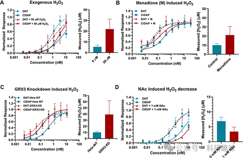 图 3. 不同条件下细胞中 H2O2 水平的定量。系统能够检测生物利基化合物对H2O2水平的影响。 例如,使用N-乙酰氨酸胺可以观察到H2O2水平的变化,展示了该系统在研究细胞红氧化应激响应中的应用。