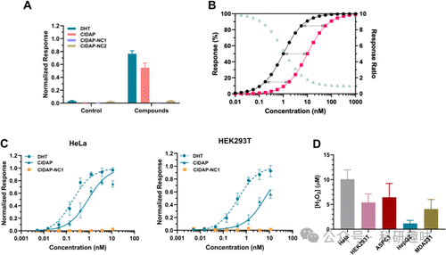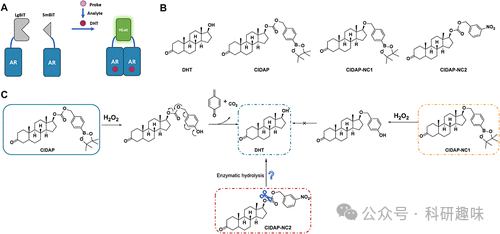 图 1. 基于化学诱导二聚化的可扩增探针(CIDAP)的设计CIDAP的设计基于H2O2的特定化学反应。 研究人员通过对H2O2与AR之间相互作用的研究,设计了能够特异性反应并释放与AR结合的分子的probe。
