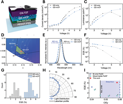 图4. QD-mCP 固溶体 PeLED 中的重组机制。最终,通过使用PeQDs-mCP固体溶液作为发光层,研究者们制备的PeLEDs实现了CIEy < 0.06的深蓝色发光,并取得了EQE的峰值值6.2%,这在深蓝色PeLEDs领域是一个重要的进展。