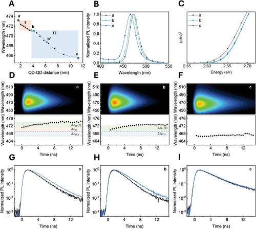 图2. 聚光特性取决于薄膜中 PeQD 之间的相互作用电子耦合主要在PeQDs之间的距离较近时发生,而能量转移则在更远的距离上也能发生。通过调整PeQDs的间距,研究者们观察到荧光光谱的蓝移,并进行了定量分析。