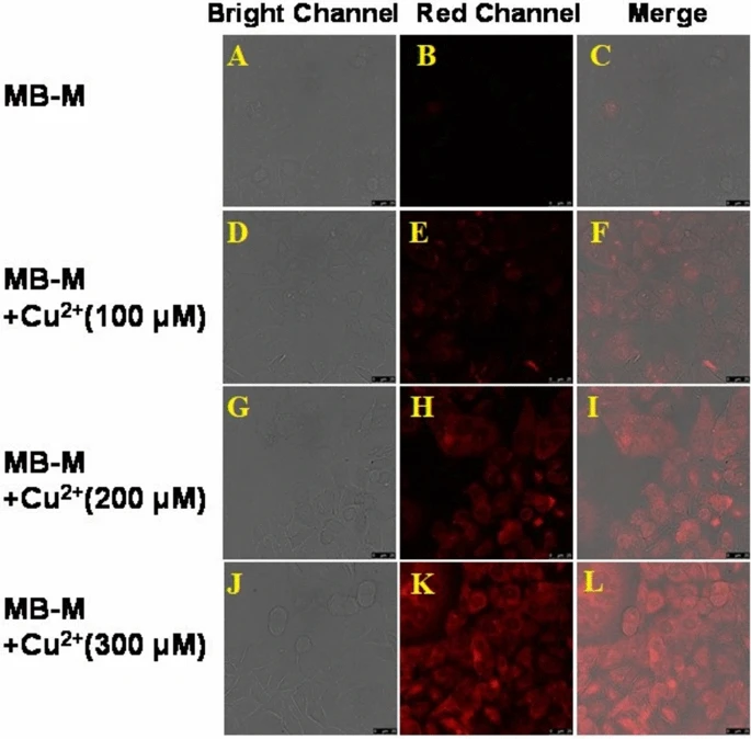 本研究报告了一种新型的基于甲基蓝的NIR(近红外)荧光探针MB-M,用于选择性检测铜(II)离子,并在活细胞成像中应用。