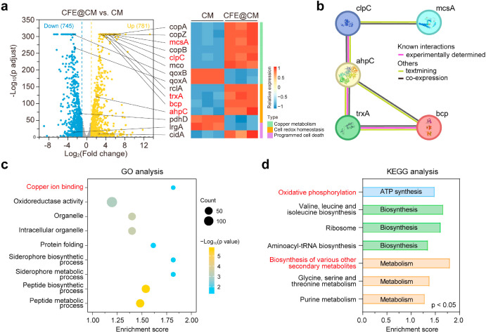 图3. CFE@CM 纳米细胞的体外抗菌效果 - mRNA测序结果揭示了CFE@CM纳米载体对MRSA的抗菌机制,即通过扰乱与铜离子结合、氧化磷酸化、肽聚合和代谢等生物学过程相关的基因表达,进一步解释了体内外实验结果。
