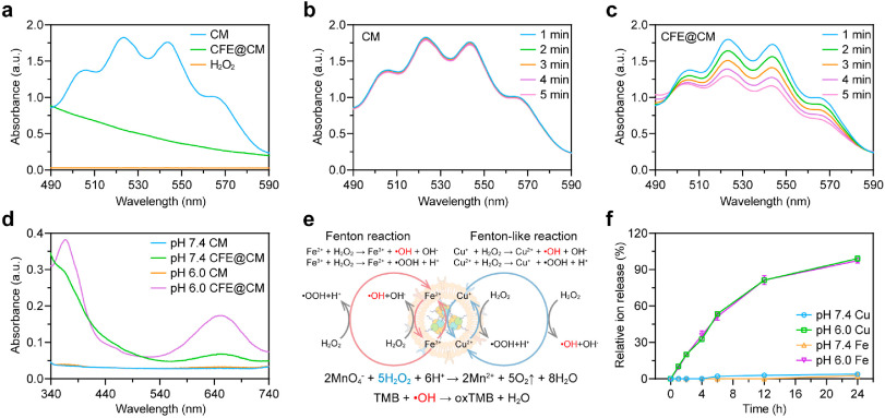 图 2. CFE@CM 纳米细胞的 H2O2 自供能力和 pH 响应性 Fenton 反应的表征。