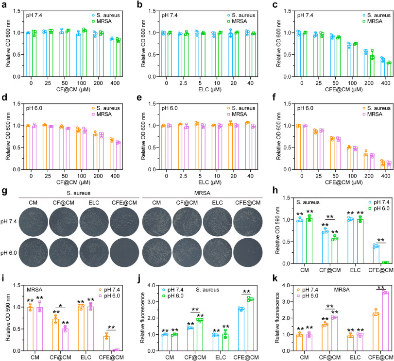 在这项研究中,研究者们构建了一种骨髓源性间充质膜包裹的纳米酶载体(CFE@CM),用于治疗脊椎炎。这种载体具有酸性响应和自我供应羟基化物的特性,能够在脊椎炎的酸性感染环境中释放铜和铁离子,以及Elesclomol(ELC),从而增强化学动力疗法(CDT)的疗效,并诱导铜死亡。研究发现,CFE@CM纳米载体能够有效抑制金黄色葡萄球菌(S. aureus)和耐甲氧西林金黄色葡萄球菌(MRSA)的生长,尤其是在酸性条件下。此外,该载体还能够抑制细菌生物膜的形成,并通过提高细菌内的活性氧(ROS)水平来增强其抗菌作用。在体实验中,CFE@CM展现了优异的生物相容性和骨髓靶向性,能够有效减轻MRSA引起的脊椎炎。通过RNA测序,研究者们发现CFE@CM对MRSA的抗菌机制可能与扰乱细菌中的铜离子结合、氧化磷酸化、肽聚合和代谢等生物学过程有关。这一发现为脊椎炎的临床治疗提供了一种新的无抗药物的治疗策略。