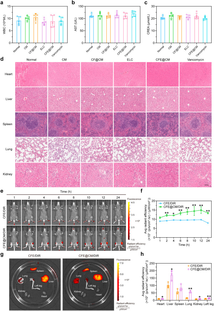 图4. CFE@CM 纳米细胞在体内的生物相容性和生物分布
