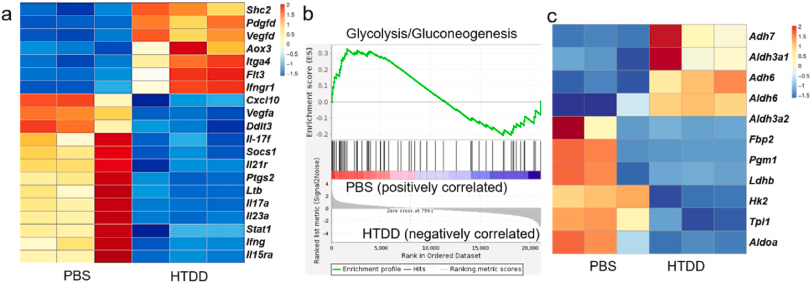 图 7. HTDD 处理后的糖酵解水平。 (a) PBS 和 HTDD 治疗的 AIA 大鼠炎症反应相关基因的差异表达热图分析。 (b) 接受 PBS 和 HTDD 治疗的 AIA 大鼠滑膜组织中糖酵解基因特征的 GSEA。 (c)接受 PBS 和 HTDD 治疗的 AIA 大鼠体内参与糖酵解的差异表达基因的热图分析。