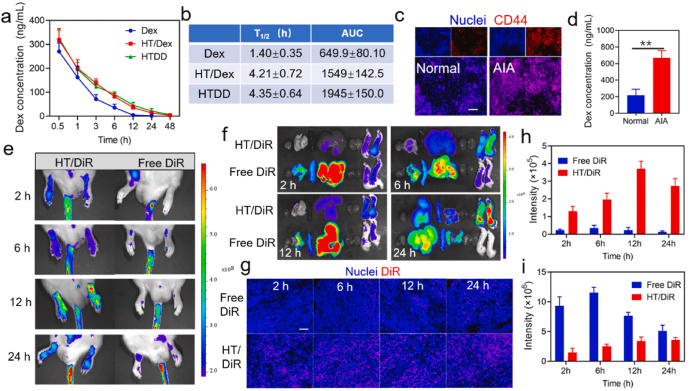 图 4. AIA 大鼠的体内药代动力学和生物分布曲线。 (a) 静脉注射游离 Dex、HT/Dex 和 HTDD 后血浆中 Dex 的药代动力学研究。 (b) 静脉注射游离 Dex、HT/Dex 和 HTDD 后 Dex 的主要药代动力学参数,n = 6。 (c) 正常大鼠和 AIA 大鼠滑膜组织中 CD44 表达的荧光染色,细胞核: DAPI, 比例尺 = 20 μm。 (d)静脉注射 HTDD 4 小时后,正常大鼠和 AIA 大鼠关节中 Dex 的含量。 (e) AIA 大鼠在不同时间点接受游离 DiR 和 HT/DiR 处理后的体内荧光图像。 (f) 大鼠在不同时间点接受游离 DiR 和 HT/DiR 治疗后的主要器官,包括心脏、肝脏、脾脏、肺脏、肾脏和关节(从左到右)的体外图像。 (g) AIA 大鼠滑膜组织中游离 DiR 和 HT/DiR 分布的代表性荧光图像,比例尺 = 20 μm。 注射后不同时间点(h)关节炎关节和(i)肝脏中游离 DiR 和 HT/DiR 的平均荧光强度定量