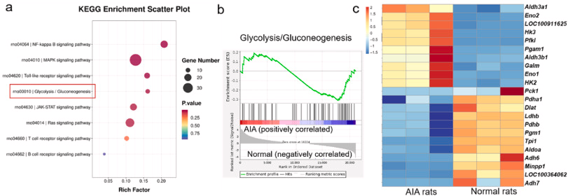 图 1. 关节炎模型中糖酵解水平的升高。 (a) 利用 AIA 和正常大鼠滑膜组织的 RNA 测序进行 KEGG 通路富集分析。 (b) AIA 和正常大鼠滑膜组织中糖酵解基因特征的基因组富集分析(GSEA)。 (c)糖酵解相关差异表达基因的热图分析。