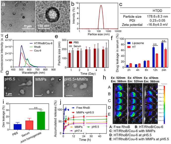 图 2. HTDD 聚合体的表征。 (a) HTDD 的 TEM 图像。 (b) 通过 DLS 测量 HTDD 的粒度分布。 (c) 通过 DLS 测量 HTDD 的 PDI 和 Zeta 电位。 (d)Cou-6 和 RhoB 之间的 FRET 效应分析,无论是游离的还是共负载在 HT 聚合体中的。 (e) HTDD 与 PBS 或 10 % 血清培养时的尺寸变化。 (f) HT/RhoB 聚合体和脂质体在不同时间点与血清培养时的药物泄漏率。 (g) 使用 TEM 观察 HT 聚体在酸性 pH 和 MMPs 存在下的形态变化。 (h) HT/RhoB/Cou-6 聚合体在酸性 pH 和 MMPs 存在下利用 FRET 效应的药物渗漏行为。 (i) 在 AIA 大鼠关节匀浆存在的情况下,HT/Dex 聚合体的 Dex 泄漏情况。 (j)HT/RhoB/Cou-6 在酸性 pH 和 MMPs 存在下的药物释放曲线。