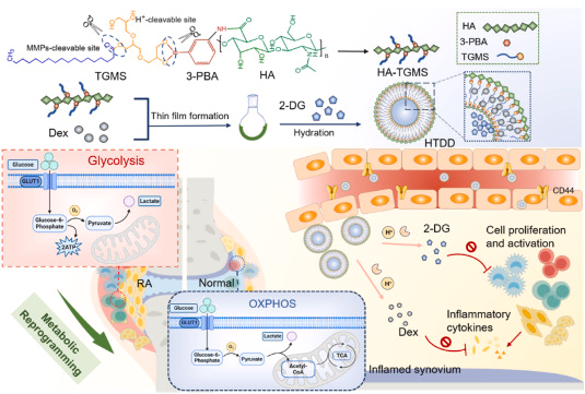 风湿关节炎(RA)是一种系统性自身免疫性疾病,以关节炎和骨质侵蚀为特征。研究表明,RA的关键事件是过度激活的免疫反应和炎症级联反应,以及炎症细胞在能量代谢方面的转变,即从氧化磷酸化(OXPHOS)向糖酵解途径的转换。2-去氧脱氧核糖(2-DG)作为一种安全有效的糖酵解抑制剂,能够抑制高能需求细胞的ATP生成,从而抑制细胞的过度增殖和激活。然而,单独使用2-DG可能导致RA缓解不佳,因为它会引起内源性应激反应,即细胞内ROS的爆发。因此,将2-DG与抗炎药物去甲肾上腺素(Dex)的有理组合可能会产生协同效应,减少2-DG引起的氧化应激,并抑制RA。研究人员设计了一种响应炎症刺激的肝化酸-三糖基单脂酸多聚体(HTDD ),用于共同将2-DG和Dex分子靶向至RA病变部位。HTDD 多聚体在血液循环中稳定,并在炎症部位特异性分布,其中过表达的金属蛋白酶(MMPs)和酸性pH触发药物的释放。实验结果表明,2-DG可以抑制细胞的过度增殖和激活,并提高Dex的生物利用度,而Dex则可以抑制炎症信号并防止2-DG引起的氧化应激。因此,这种组合策略最终通过抑制糖酵解和炎症信号传导,减轻了RA的症状。此外,研究还揭示了HTDD 多聚体在RA治疗中的潜力,并提供了新的治疗视角。