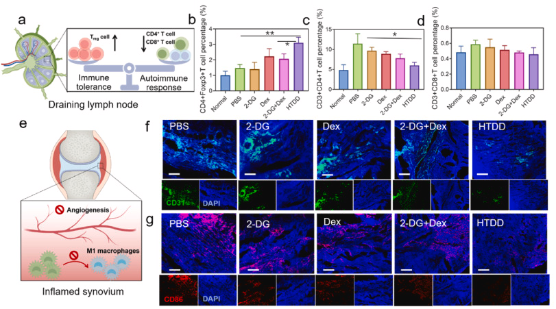 图 6. 炎症部位的自身免疫激活和炎症细胞过度增殖。 (a) 引流淋巴结中免疫耐受和自身免疫反应之间的平衡示意图。 (b) 各种治疗后引流淋巴结中的 Treg 细胞群。 (c)不同治疗后引流淋巴结中的 CD4+ T 细胞数量和(d)CD8+ T 细胞数量,n = 5。 e)炎症滑膜中滑膜血管生成和巨噬细胞再极化示意图。 (f)不同治疗后关节炎症中滑膜血管生成的代表性荧光图像,CD31:血管内皮细胞。 (g)不同治疗后关节炎症中 M1 巨噬细胞浸润的代表性荧光图像。