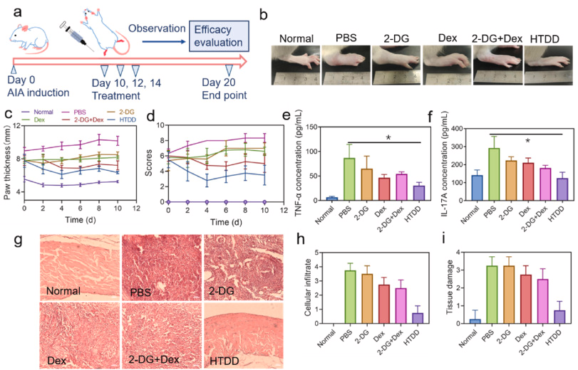 图 5. HTDD 在 AIA 模型中的疗效。 (a) HTDD 治疗的实验时间表示意图。 (b) 各种治疗后关节外观的代表性照片。 治疗过程中各组(c)爪子厚度和(d)关节评分的变化。 各组在不同治疗后的炎症细胞因子,包括(e)TNF-α 和(f)IL-17A。 (g)通过 HE 染色对各组不同处理后的炎性滑膜进行组织病理学检查,刻度线 = 20 μm。 基于 HE 染色的(h)细胞浸润和(i)软骨侵蚀的平均得分。