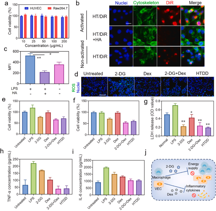 图 3. 细胞共定位、细胞增殖和抗炎功效。 (a) HT 多聚体在 HUVEC 和 Raw264.7 中的细胞活力。 (b) 活化或未激活 HUVEC 中细胞摄取 HT/DiR 的代表性荧光图像,比例尺 = 20 μm。 细胞核: 细胞骨架:DAPI FITC-phalloidine. (c) 使用流式细胞仪定量分析 HT/DiR 多聚体在 HUVEC 中的吸收效率。 (d) 以 DCFH-DA 为探针,各处理组 ROS 水平的代表性荧光图像: 细胞核:DAPI,比例尺 = 100 μm。 LPS 激活的 (e) Raw264.7 和 (f) HUVEC 经不同药物处理后的细胞增殖情况。 (g) 不同药物处理后 LPS 激活的 Raw264.7 的 LDH 水平。 不同药物处理后 LPS 激活的 Raw264.7 中的炎症细胞因子水平,包括 (h) TNF-α 和 (i) IL-6。