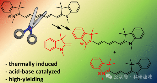 这篇文章主要报道了一种热缩短反应,即在特定条件下将花菁类染料(Cy7)的七元烷链缩短为五元烷链(Cy5)和三元烷链(Cy3)的过程,并对该反应机制进行了深入研究。