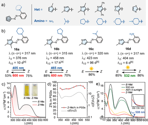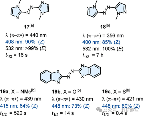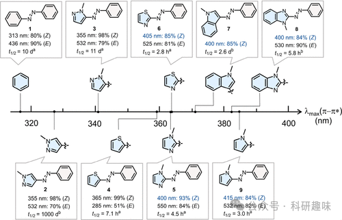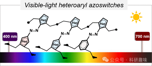 - 单杂环偶氮开关可以通过选择富电子的杂环或在苯环上引入电子给体官能团来实现可见光激活的光异构化反应。