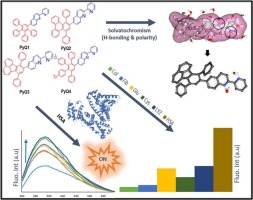 吡啶-喹啉(PyQ)混合系统的荧光溶剂致变色效应显著。 该研究发现溶剂氢键供体能力是光谱位移的主要驱动力。这些探针对人血清白蛋白(HSA)展现出高度选择性和荧光增强效果,检测限极低,是极具潜力的诊断传感器。